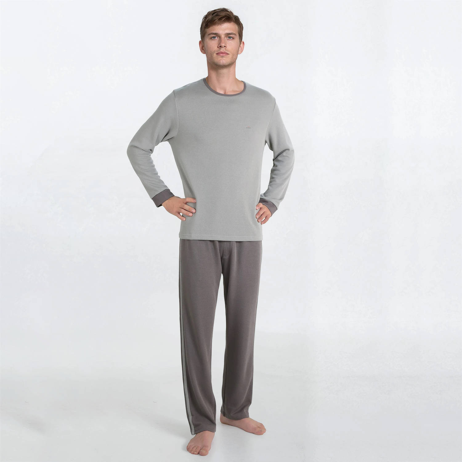 Pánské pyžamo z příjemného a teplého materiálu. Pohodlný volný střih. Vyrobeno z výběrové bavlny a modalu. Kalhoty mají jednu kapsu vzadu.