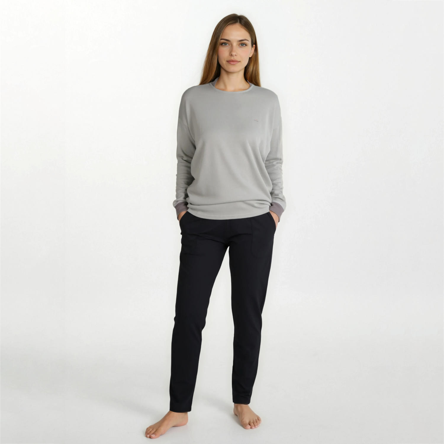 Pohodlné teplé pyžamo, které můžete nosit také jako domácí oblečení. Vyrobeno z bavlny a modalu. Speciální límeček chrání vaši šíji. Kalhoty mají vysoký pas s jemnou všitou gumou a dvěma předními kapsami.